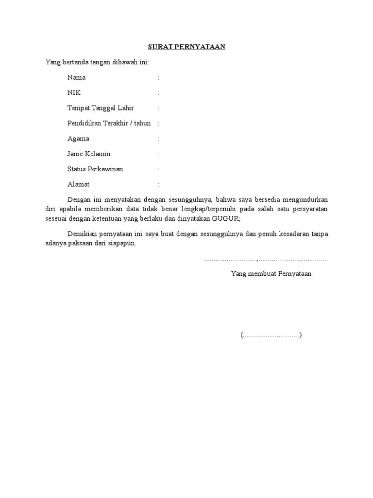 Contoh surat pernyataan kesediaan diri digunakan ketika seseorang akan menempati suatu jabatan di instansi tertentu. Surat pernyataan bermaterai adalah surat yang dibuat/ditulis oleh seseorang yang mana untuk menerangkan dirinya dalam keadaan tertentu yang mana surat pernyataan ini mempunyai banyak kegunaan, seperti halnya untuk surat pernyataan belum menikah, surat pernyataan sanggup. We are a sharing community. Nama tempat dan tanggal lahir : Surat pengunduran diri kerja atau resign letter adalah surat pernyataan bahwa seseorang mengundurkan diri dari pekerjaannya dengan suatu alasan tertentu.